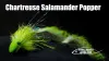 Popper version of my very effective Chartreuse Salamander Jig. For surface action with pike, musky, bass, trout, perch and other predators.